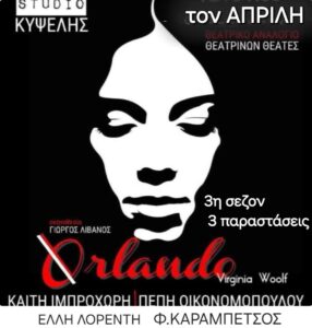Οι ΘΕΑΤΡΙΝΩΝ ΘΕΑΤΕΣ επαναλλαμβανουν & φέτος το επιτυχημένο ανοιξιάτικο θεατρικό αναλόγιο, που έχει καθιερωθεί στο STUDIO ΚΥΨΕΛΗΣ, φέτος ενώνουν 2 κυρίες της ελληνικής θεατρικής σκηνής που συναντούν το περίφημο ΟΡΛΑΝΤΟ της ΒΙΡΤΖΙΝΙΑ ΓΟΥΛΦ. Την ΚΑΙΤΗ ΙΜΠΡΟΧΩΡΗ και την ΠΕΠΗ ΟΙΚΟΝΟΜΟΠΟΥΛΟΥ, βασικά στελέχη της ομάδας. Μαζί μας επίσης οι ηθοποιοι Έλλη Λορεντη και Φοίβος Καραμπετσος.