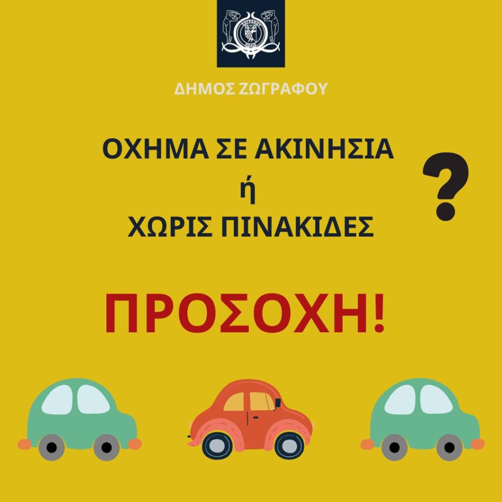Ο Δήμος Ζωγράφου ενημερώνει ότι η παραμονή οχήματος σε δημόσιο ή κοινόχρηστο χώρο, το οποίο δεν διαθέτει πινακίδες κυκλοφορίας ή βρίσκεται σε μακροχρόνια ακινησία, θεωρείται παράνομη σύμφωνα με την ισχύουσα νομοθεσία.