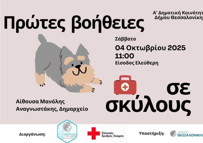 Το Σάββατο 4 Οκτωβρίου στις 11.00 π.μ. ο Δήμος Θεσσαλονίκης, η Α’ Δημοτική Κοινότητα και ο Ερυθρός Σταυρός σας προσκαλούν να γιορτάσουμε μαζί την Παγκόσμια Ημέρα Ζώων με ένα χρήσιμο σεμινάριο Πρώτων Βοηθειών για σκύλους.