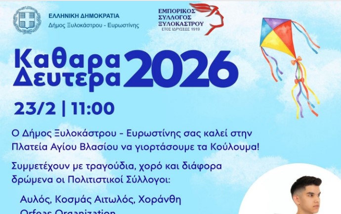 Ο Δήμος Ξυλοκάστρου – Ευρωστίνης, σε συνεργασία με τον Εμπορικό Σύλλογο Ξυλοκάστρου, σας προσκαλεί στον εορτασμό της Καθαράς Δευτέρας 2026, την Δευτέρα 23 Φεβρουαρίου στις 11:00 π.μ. στην Πλατεία Αγίου Βλασίου.