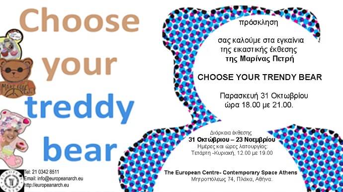 Με υπότιτλο Choose your Trendy Bear περίπου 60 διαφορετικά έργα με αρκουδάκια σας περιμένουν στα εγκαίνια της έκθεσης τους την Παρασκευή 31 Οκτωβρίου από τις 18.00 μέχρι τις 21.00 στο Ευρωπαϊκό Κέντρο στην Αθήνα (Ευρωπαϊκό Κέντρο Αρχιτεκτονικής Τέχνης, Σχεδιασμού και Αστικού Περιβαλλοντικών Σπουδών).