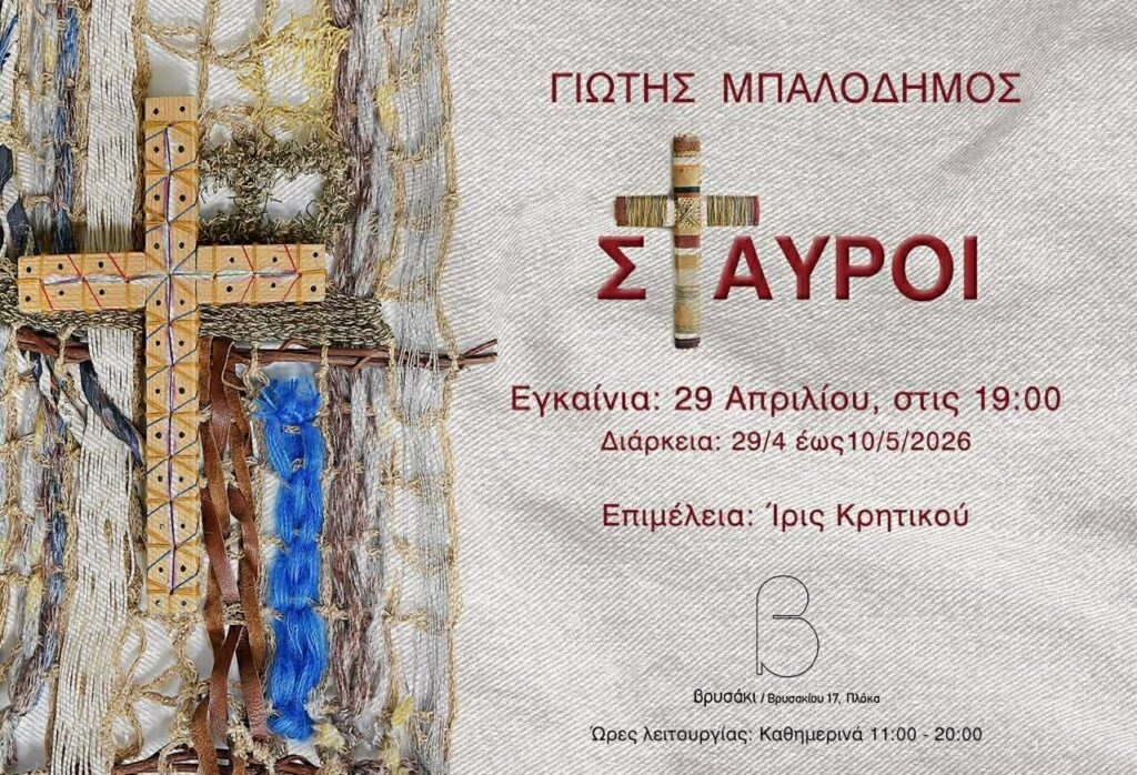 Στην έκθεσή του «Σταυροί», με αναβλύζουσα εφευρετικότητα και καλλιτεχνική αρτιότητα, ο Γιώτης Μπαλοδήμος καταθέτει μια σειρά γλυπτών σταυρικών έργων που συνθέτουν ένα εξέχον αλφαβητάριο έμπνευσης, οικονομίας μέσων, ανακύκλωσης και επανάχρησης εφήμερων υλικών και έξεργης χειρωναξίας. Ξύλα και υφάσματα, πρόκες και καρφιά, γύψος και κερί, πλαστικά απορρίμματα, σχοινιά, στημόνια και κουρελάκια, αλυσίδες και ρινίσματα ή ελάσματα μετάλλου, πλάθονται και υφαίνονται, κεντιούνται και ζωγραφίζονται, αρμολογούνται και τρέπονται σχεδόν θαυματουργά σε αισθητικές και εννοιολογικές αυτοτέλειες. Σε αυτοδύναμες οργανικές νησίδες που διέπονται από ορατή εννοιολογική αφετηρία, σοφή οικονομία μέσων, απέριττο χιούμορ και ευπρόσδεκτη σκηνική τρυφερότητα.