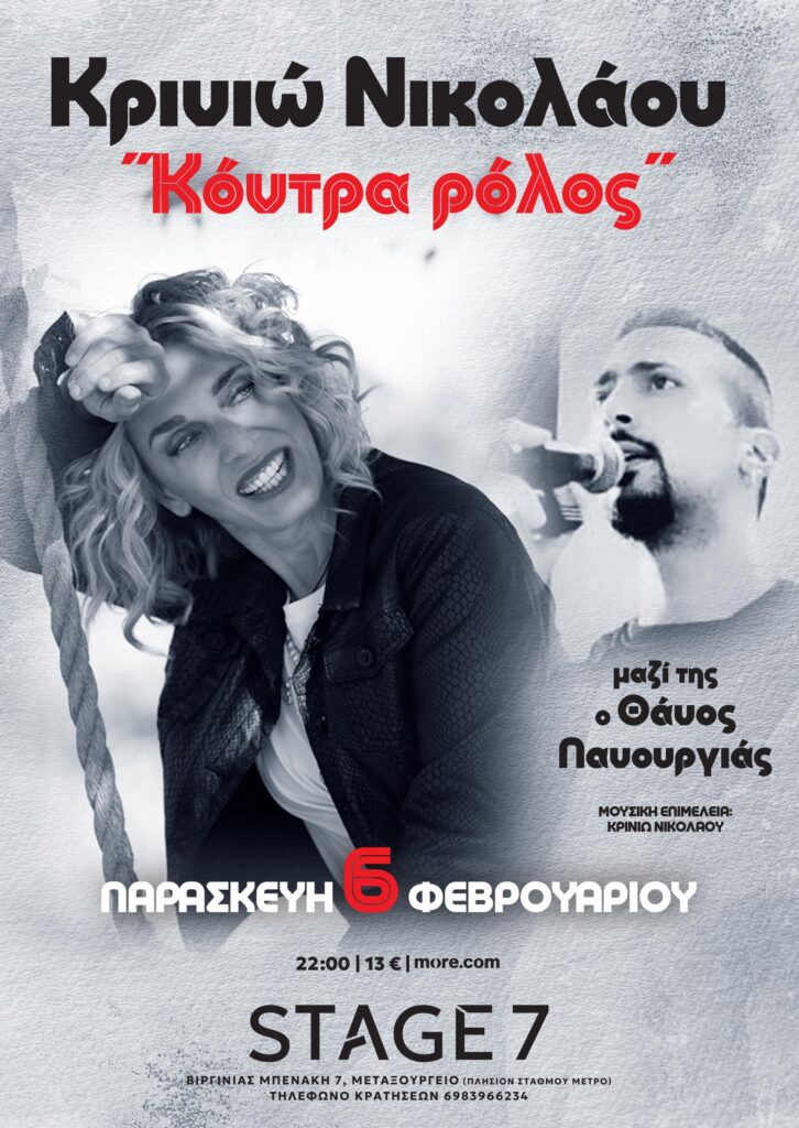 Η Κρινιώ Νικολάου έρχεται στη σκηνή του Stage 7 με την παράσταση «Κόντρα ρόλος», ένα μουσικοθεατρικό ταξίδι γεμάτο χιούμορ, συγκίνηση και ανατροπές. Μαζί της, σε έναν απρόσμενο καλλιτεχνικό διάλογο, ο νέος ερμηνευτής και πολλά υποσχόμενος Θάνος Πανουργιάς .