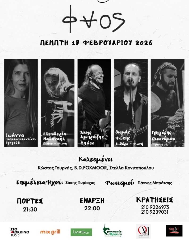 Το νεοσύστατο συγκρότημα ΦΑΟΣ μας προσκαλεί την Πέμπτη 19 Φεβρουαρίου στο club στον Σταυρό του Νότου για την πρώτη τους live εμφάνιση. Μαζί τους θα είναι οι αγαπημένοι τους φίλοι Κώστας Τουρνάς, B.D. Foxmoor και Στέλλα Κονιτοπούλου.