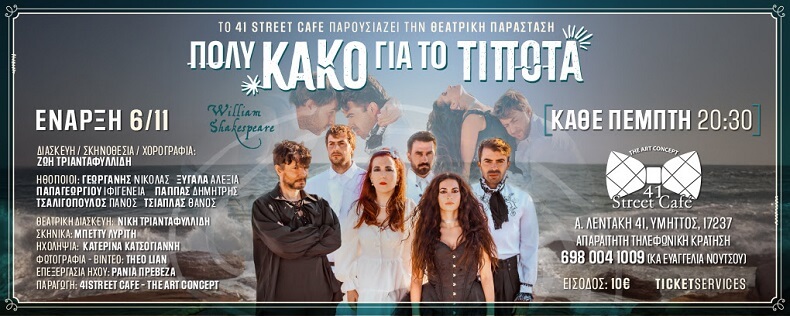 Το bar/theater 41street café, Ανδρέα Λεντάκη 41, Υμηττό, κάθε Πέμπτη στις 20.30 επανέρχεται στις θεατρικές παραγωγές και παρουσιάζει το έργο «Πολύ Κακό για το Τίποτα» του Ουίλλιαμ Σαίξπηρ, σε διασκευή/σκηνοθεσία Ζωής Τριανταφυλλίδη (περιορισμένες παραστάσεις).