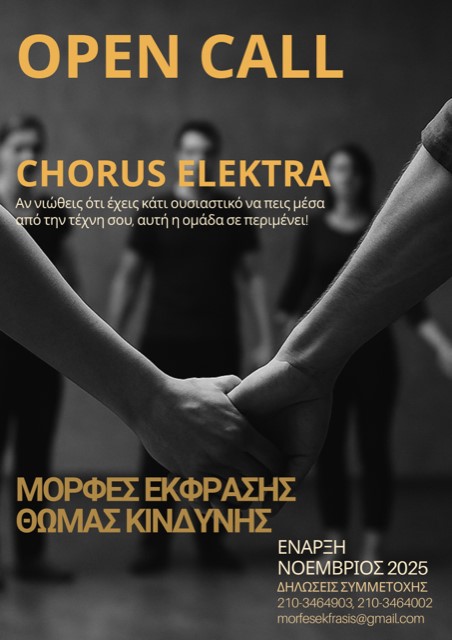 Οι ενδιαφερόμενοι να καταθέσουν τα βιογραφικά τους στο morfesekfrasis@gmail.com με τίτλο “Chorus Elektra” έως τις 27/10. Οι επιλεχθέντες θα ειδοποιηθούν μέσω email για την προσωπική τους ακρόαση που θα πραγματοποιηθεί στις 30 Οκτωβρίου.