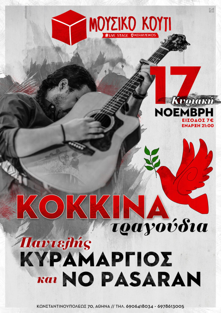Ο Παντελής Κυραμαργιός και οι No Pasaran μας προσκαλούν στο καθιερωμένο τους live την Δευτέρα 17 Νοεμβρίου στη νέα μουσική σκηνή «Ράδιο» στον Κεραμεικό με τα «Κόκκινα τραγούδια»!