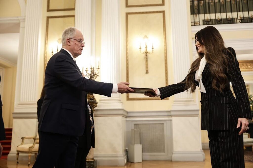 Στην τελετή επίδοσης των διαπιστευτηρίων παρέστησαν η Υφυπουργός Εξωτερικών Αλεξάνδρα Παπαδοπούλου και η Γενική Γραμματέας της Προεδρίας της Δημοκρατίας, Πρέσβης Αλίκη Χατζή.