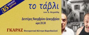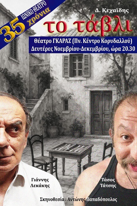 Το Ιωνικό Θέατρο εορτάζει τα 35 χρόνια συνεχούς παρουσίας του στα πολιτιστικά δρώμενα της ευρύτερης περιοχής του Πειραιά, παρουσιάζοντας το έργο του Δ. Κεχαϊδη, ΤΟ ΤΑΒΛΙ.