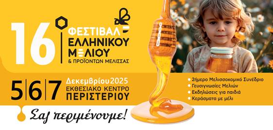 Το μεγάλο γιορτινό ραντεβού του κόσμου της μελισσοκομίας, το 16ο Φεστιβάλ Ελληνικού Μελιού & Προϊόντων Μέλισσας, διοργανώνεται στις 5, 6 και 7 Δεκεμβρίου 2025, στο σύγχρονο Εκθεσιακό Κέντρο Περιστερίου.