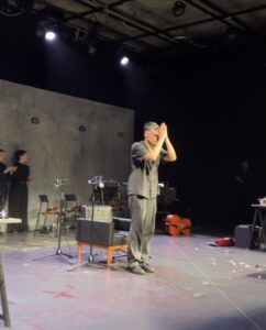 λειτούργησαν ως οργανικό στοιχείο της δραματουργίας. Σε καίριες στιγμές, ο ηθοποιός έδινε διακριτικά το σήμα, επιτυγχάνοντας μια άρτια ρυθμική σύμπλευση λόγου, κίνησης και ήχου. Η μουσική δεν ακολουθούσε απλώς την δράση, τη συνδιαμόρφωνε, δημιουργώντας ένα ηχητικό περιβάλλον που λειτουργούσε σχεδόν ως << εσωτερική φωνή>> της σκηνής.
