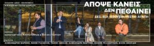«Το «Απόψε κανείς δεν πεθαίνει» είναι μια συλλογική απόπειρα να προσεγγίσουμε, μέσα από το θέατρο, το θεμελιώδες κι όμως κάπως αυθαίρετο ερώτημα: «Τι είναι αυτό που ορίζει τη ζωή μας;» Πέντε άξονες χαράχτηκαν ως οδηγοί αυτού του ταξιδιού: σεξ, βία, εξουσία, πίστη, αγάπη. Αφουγκραστήκαμε την αίσθηση πως πολλά ξεπερνούν τη δύναμη του ατόμου και αναζητήσαμε τρόπους να υφάνουμε στην αφήγηση την αέναη ορμή του ανθρώπου για ελευθερία, για υπέρβαση. Η πορεία των πέντε θεματικών διαγράφει μια διαδρομή από την πιο σαρκική όχθη της ανθρώπινης εμπειρίας ως την πιο πνευματική. Δεν επιχειρούμε ιστορική αναδρομή· οι θεματικές αναδύονται όπως τις αντιλαμβανόμαστε εμείς σήμερα, με ευγνωμοσύνη για το προνόμιο να ζούμε σε τόπο ειρηνικό.